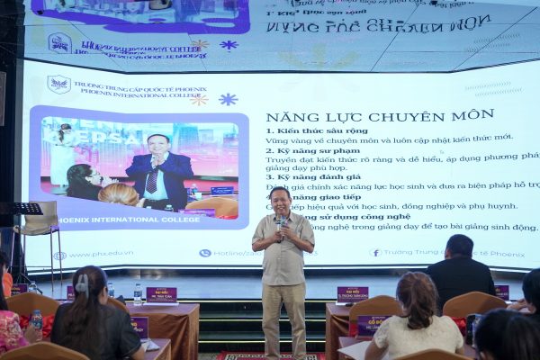 Phát biểu của thầy Hiệu Trưởng tại sự kiện nhấn mạnh tầm quan trọng của giáo viên trong việc xây dựng nền tảng giáo dục vững chắc, với cam kết đào tạo giáo viên đạt chuẩn quốc tế và cung cấp môi trường học tập năng động, sáng tạo. Thầy cũng chia sẻ các cơ hội nghề nghiệp hấp dẫn dành cho giáo viên tại Phoenix, từ việc giảng dạy trực tiếp cho đến việc tham gia vào các vai trò quản lý và chuyên gia đào tạo nội bộ trong hệ sinh thái Phoenix Universal.